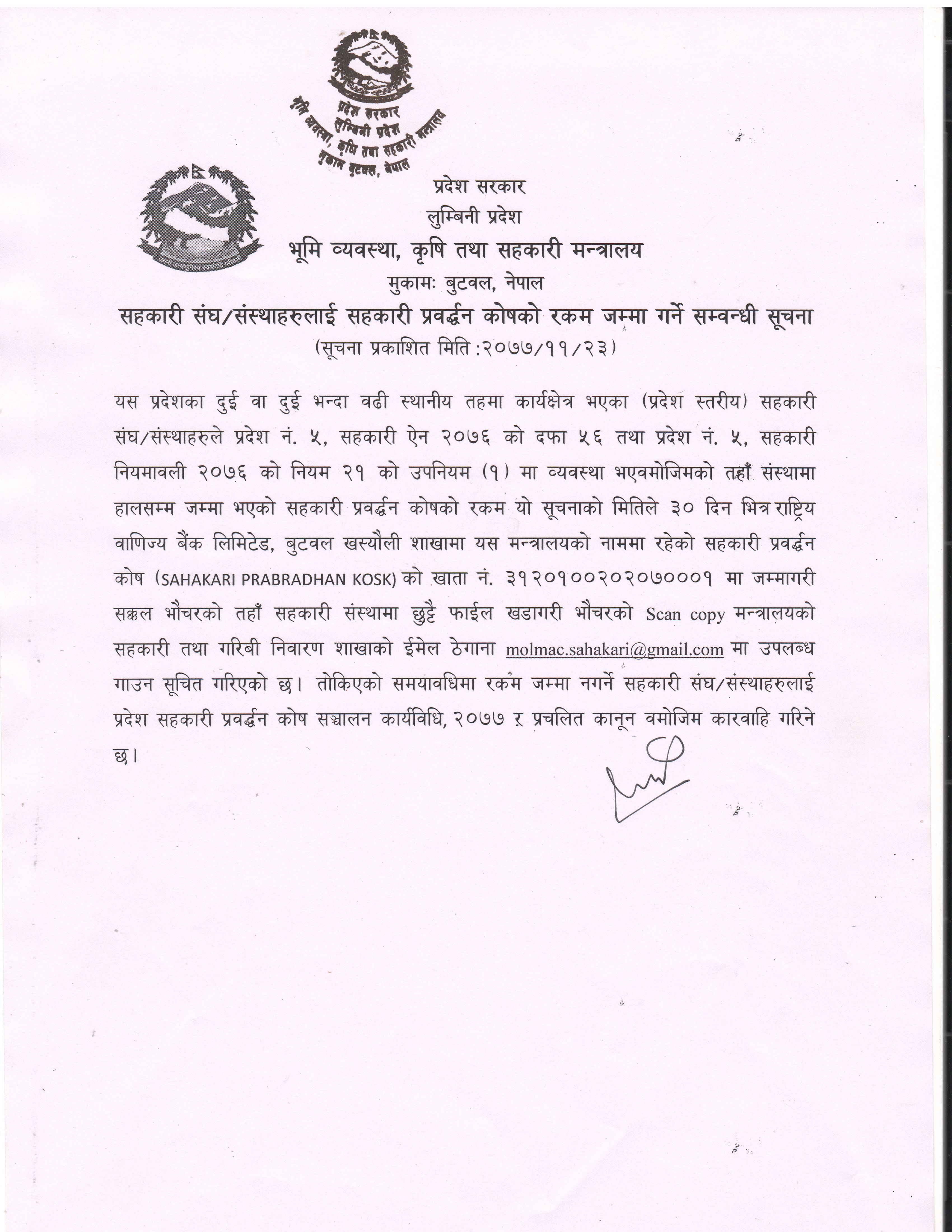 सहकारी प्रवर्द्धन कोषको रकम जम्मा गर्ने सम्वन्धि प्रदेश स्तरीय सहकारी/संघ संस्थालाई सूचना